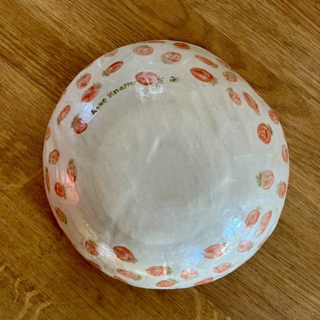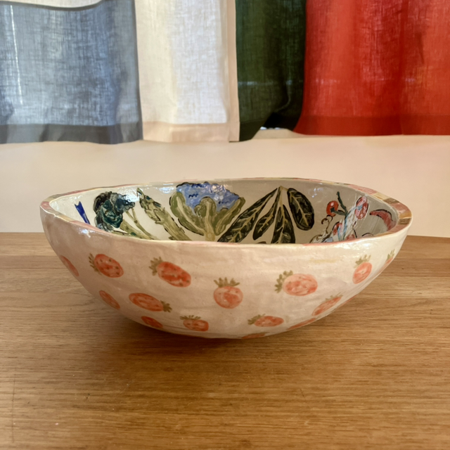 A fruit bowl painted with vegetables and 2 nudes. On the outside I painted strawberries.